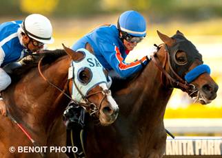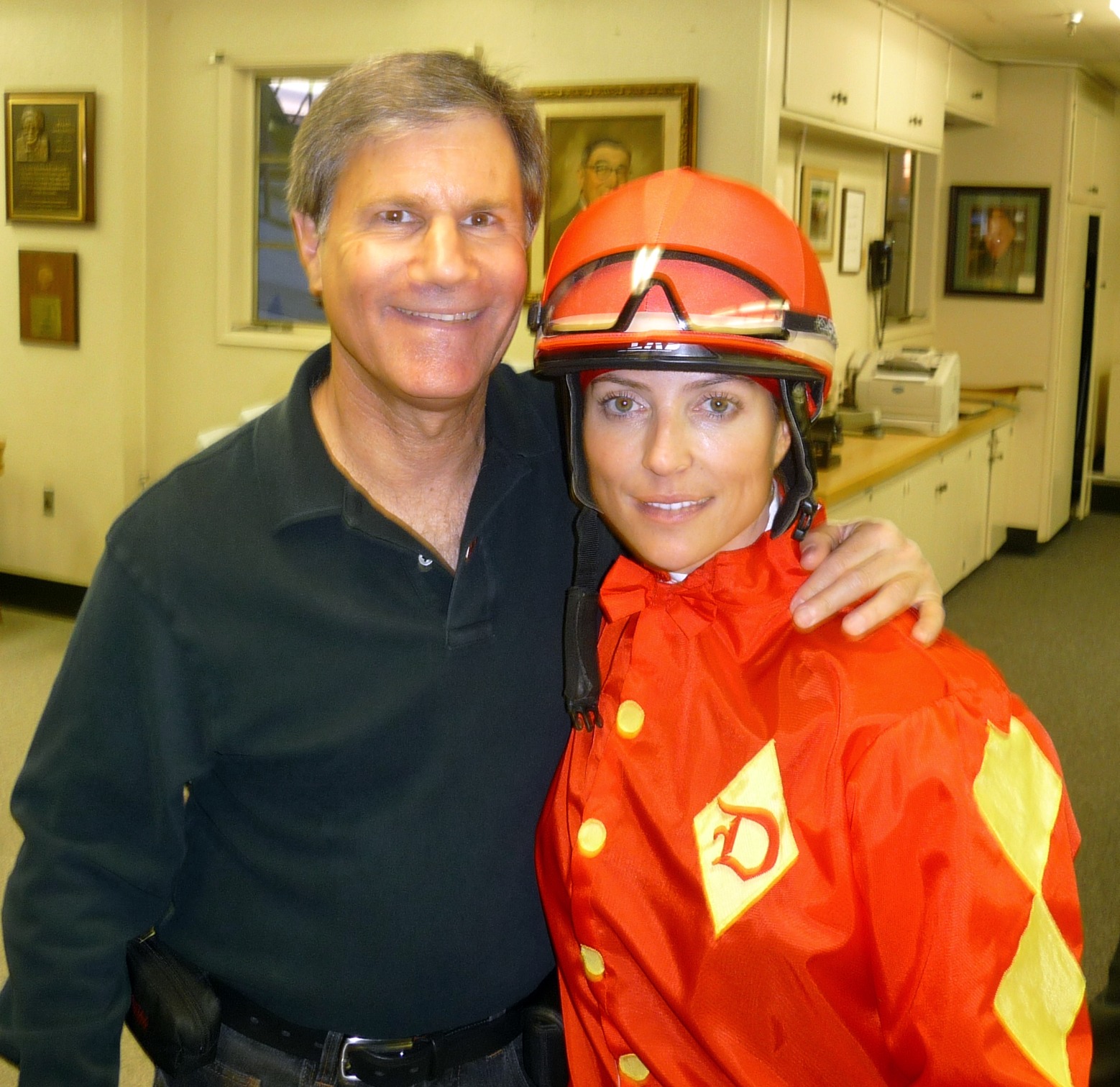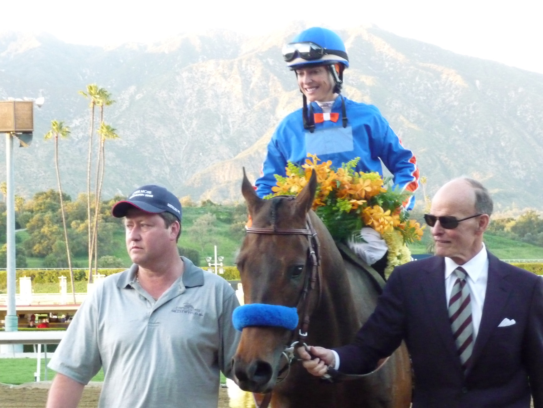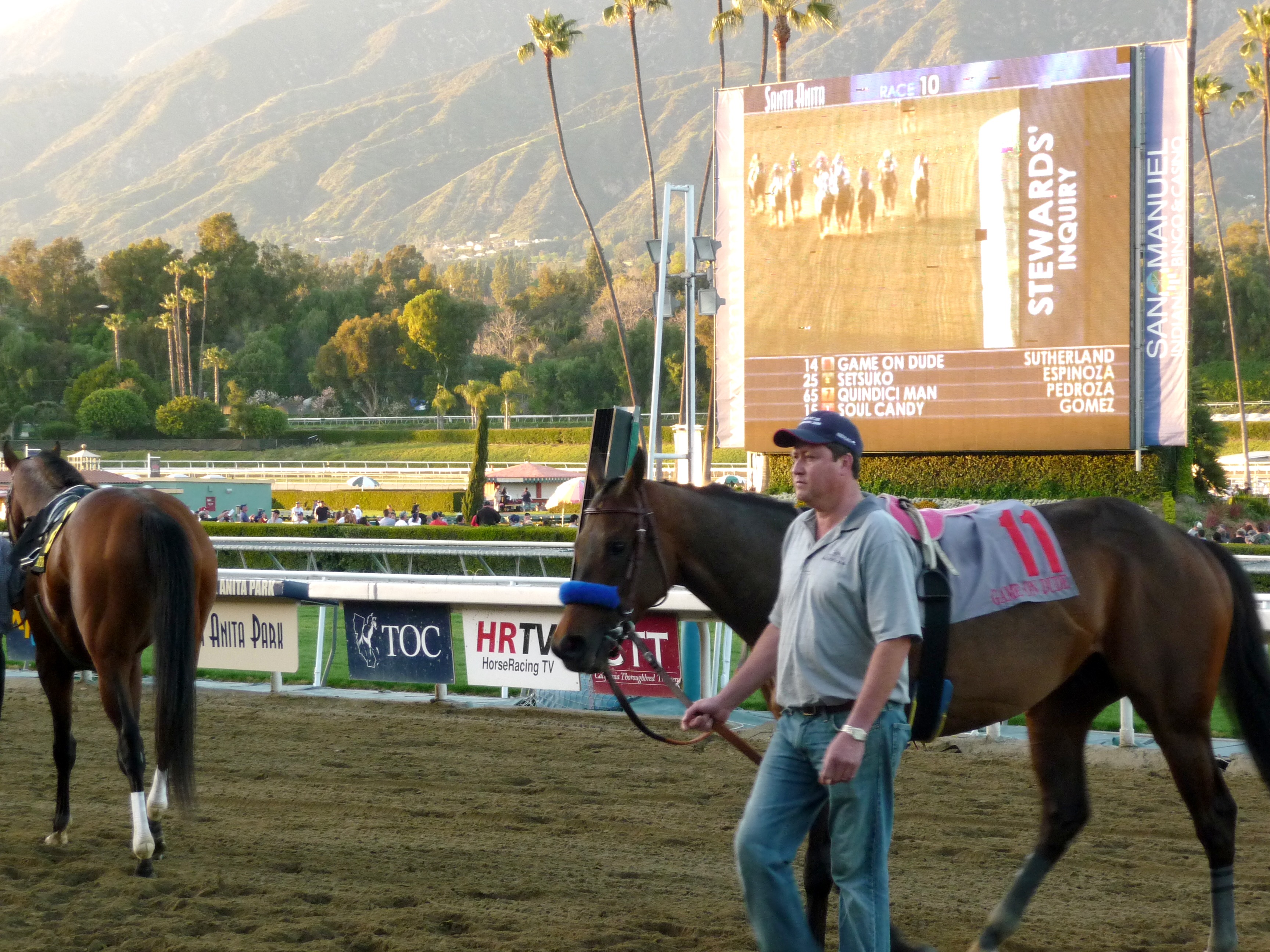 WOW, what a race and what a decision by the stewards to leave the Bob Baffert trained Game On Dude as your longshot (at almost 15-1) winner of the most controversial non-disqualification finish in Santa Anita Handicap history! And Baffert had entered 4 horses in this race including the early leader (and 2nd betting choice) First Dude, so I guess it was only fitting that the finest chick on the grounds led one of his dudes to victory.