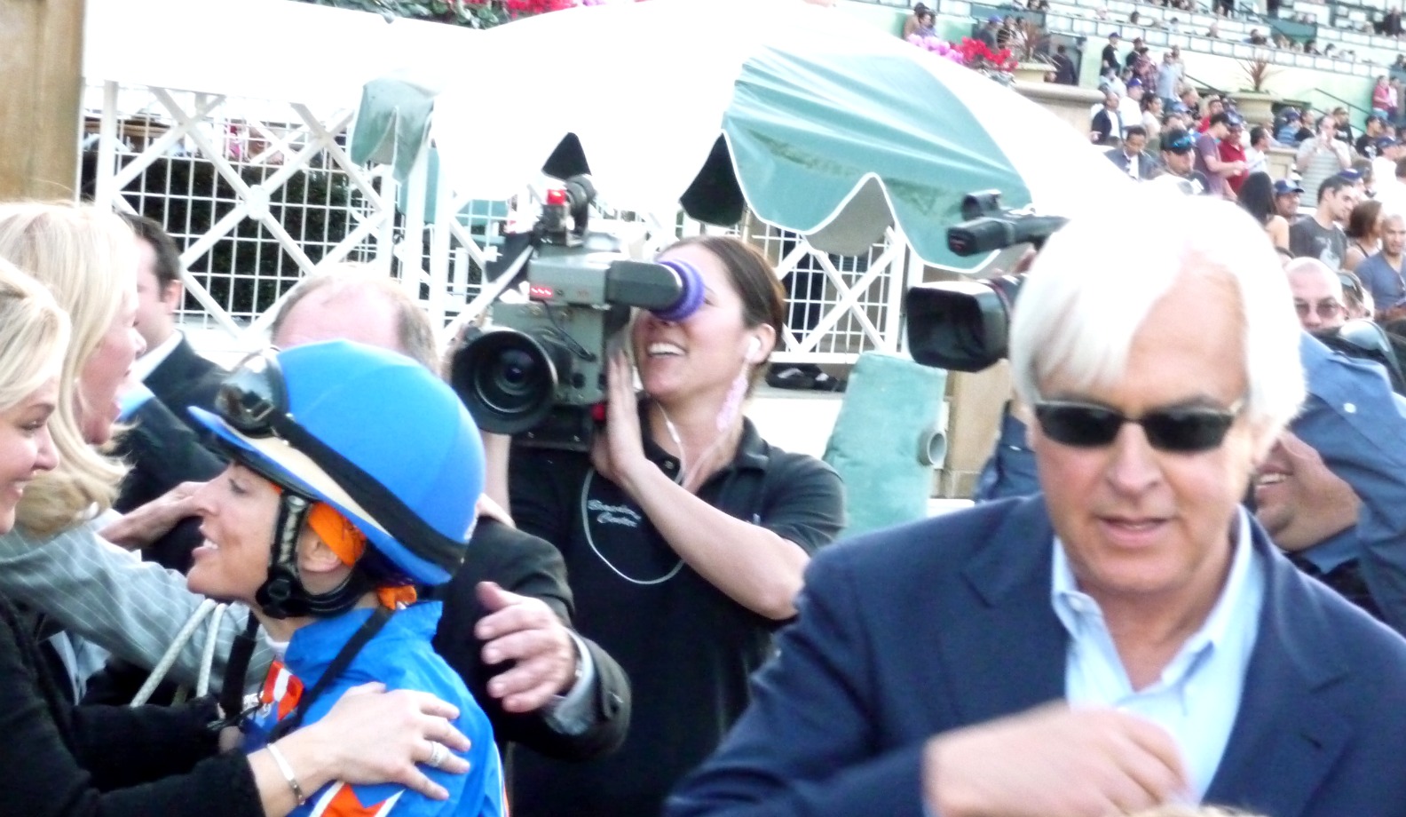 And it was exciting to be in and around the winner’s circle as the racing world debated (during a 12 minute video tape review by the stewards) whether or not the first female winner of the ‘Big Cap’ Chantal Sutherland should’ve been taken down for her horses’ bumping incident at the top of the stretch (which you can see clearer if you click on the picture to the right that I took from the press box). Victor Espinoza, who was aboard the 2nd place finisher and 25-1 shot Setsuko even said βI donβt know why it took so long to make the wrong decision. I think the stewards are blind.” Refreshingly, Espinosa is allowed to speak his mind…could you imagine if David Stern was the racing commissioner? I could see Victor being suspended and fined most of his day’s earnings for that comment!