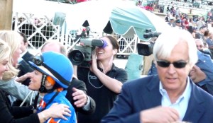 So after receiving many boos and plenty of cheers too on her way back to the jock’s room, I caught up with the winning jockey after changing silks before the final race of the day (which she finished in 3rd at odds of 20-1) and she explained her entire viewpoint of what could’ve cost her greatest victory while possibly affecting the race’s heavy favorite Twirling Candy’s chances as well (although he was ruled to have been responsible for the bumping incident).