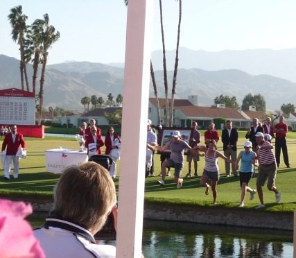 World #1 Yani Tseng had a 2 stroke lead going into the final round of the Kraft Nabisco so of course she won easily, right? Wrong! Stacy Lewis who had never won an LPGA event took over the top of the leaderboard at the turn and won by 3 shots for a major championship and a story that’s almost hard to believe. We found out during the trophy ceremony that a major golfing inspiration in her life-her Grandfather Al had died on Wednesday after some year’s with alzheimer’s disease. And Stacy went out with that bulldog mentality that she’s known for and shot rounds of 66, 69, 71, and 69 for the right to jump into Poppy’s Pond (the annual ritual for the KNC Champ originating with Amy Alcott in 1988).