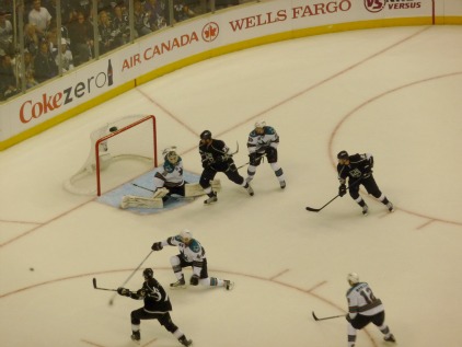 Once it again it shows how meaningless momentum can be in this game, as the Kings got their rabid sellout crowd going nuts when they tied the game at 3-3 just 18 seconds into the 3rd period on a beautiful follow up shot by Ryan Smythe on the doorstep. But once again the Sharks regained the lead 8 minutes later on an unassisted goal by Danny Heatley. The Kings actually scored a 2nd power play goal on the night when Trevor Lewis blasted one in from the right circle at 11:39 and then came that late 5 minute PP opportunity for the Kings which they only mustered up 4 shots and maybe one good scoring chance which never lit the lamp.