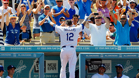 What a first weekend in the major leagues for 25 year old Bellflower native Justin Sellers who was just promoted from Triple-A Albuquerque on Friday when rookie shortstop Dee Gordon went on the disabled list. Sellers spent many innings during frequent visits to Dodger Stadium with his parents when he was a kid and to see his dream come true at his favorite ballpark is what playing sports is all about.