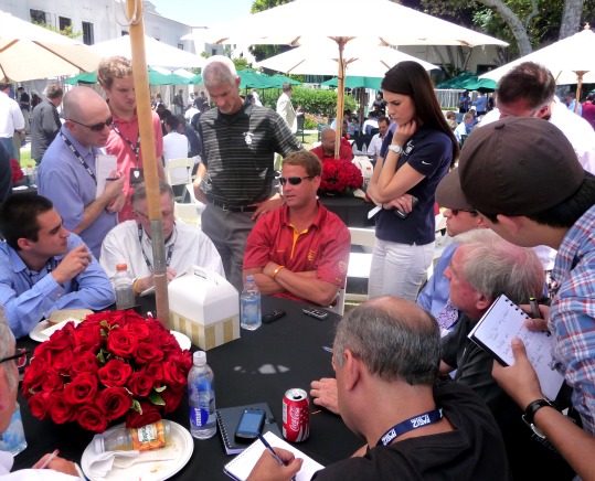 But the most fun I had was having lunch at the same table as Heisman Trophy favorite Andrew Luck, who’s as nice and genuine as anyone you’d like to meet (almost Manning-like in his obvious quality up-bringing). Along with a few other media types who came and went, we gabbed about so many things for at least 30 minutes (unfortunately too much of it not recorded) but I did get some of his thoughts for your listening pleasure including why he came back for another year at Stanford? He also told me a great story (off mic) that his dad Oliver (Ex-NFL QB) who played with Archie Manning, actually baby-sat for Peyton which Andrew used to love to tell his teammates about. I also asked Luck if he knew of the beard that Bill Walton once wore with the Portland Trailblazers? And he said vaguely…so I told him to google the guy because his newly-grown facial hair resembles either Walton’s or Paul Bunyon’s…you be the judge! It will be verrrrry interesting to see if the next year’s likely #1 NFL draftee’s new beard is either good or bad LUCK?… π
