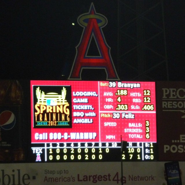 You knew the Angels knew they were in trouble when with Russell Branyon as the tying run at the plate with no outs in the 9th inning, they were promoting 2012 Spring Training on the scoreboard (not a good sign-LITERALLY!).