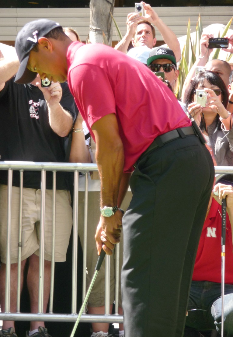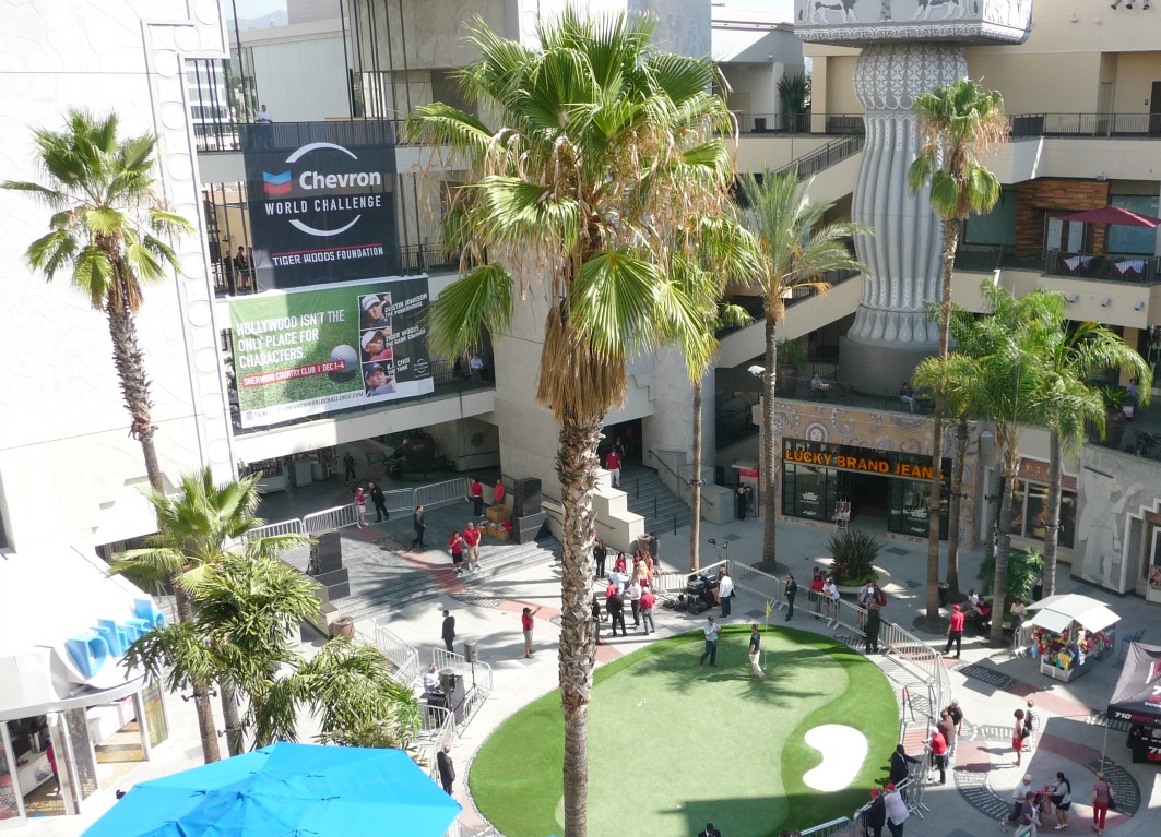 The Tiger Woods Foundation took over the Hollywood & Highland Center in the heart of Hollyweird for a few hours to hold their pre-tournament press conference followed by a putting challenge with 4 fans given the chance to putt with Tiger. And the lucky winner (after some good-natured ribbing and laughs) received passes to walk inside the ropes with Woods during the opening round of his tourny on December 1.