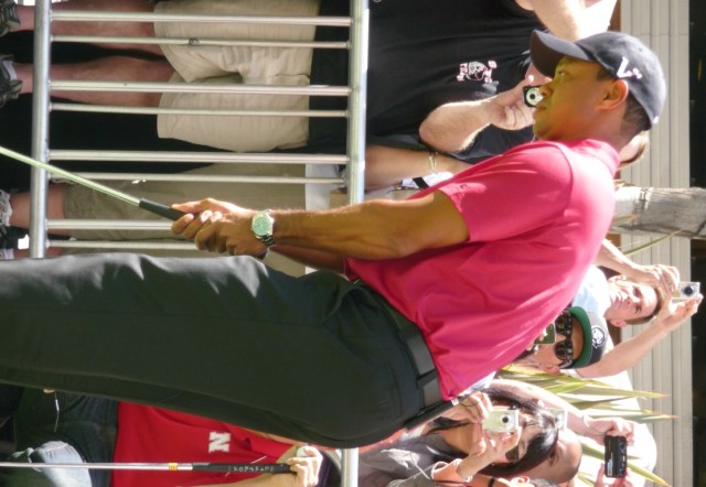 Tiger’s foundation President/CEO Greg McLaughlin led off the presser by announcing the 2011 Chevron World Challenge field and then Woods spoke with us media types and I got several questions in. Including if he can still pass Jack Nicklaus’ record of 18 major championships (Tiger’s at 14), and if he still likes hot dogs after Sunday’s incident on the green at the Fry’s Dot Com tournament (where he finished T-30) when a fan threw a dog at Tiger on his way to being arrested near the 7th green. And you think you had a weird Sunday? π