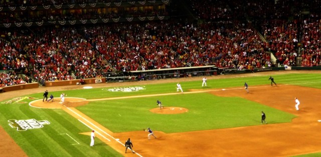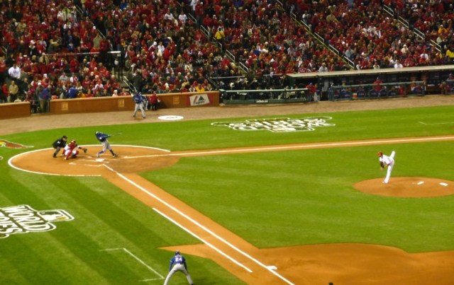 Like the last few weeks, the Cardinals found another way to win as Temecula’s Allen Craig pinch-hit for ace Chris Carpenter and delivered a go-ahead single in the sixth inning which stood up thanks to the Cards bullpen and closer Jason Motte who saved the day in the 9th inning. I spoke with both of those guys and other key members of the series opener making this miserably cold and damp night in St. Lou worth it all. The following is a taste of the atmosphere for game one (and my self proclaimed ‘Media Grand Slam’) while giving you a little flavor from the ultimate baseball city. These fans eat, drink, and sleep the Cardinals so after a Series opening 3-2 win, they are in “red heaven”!…