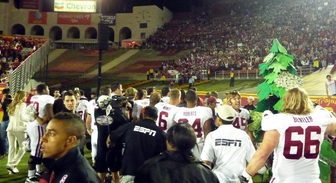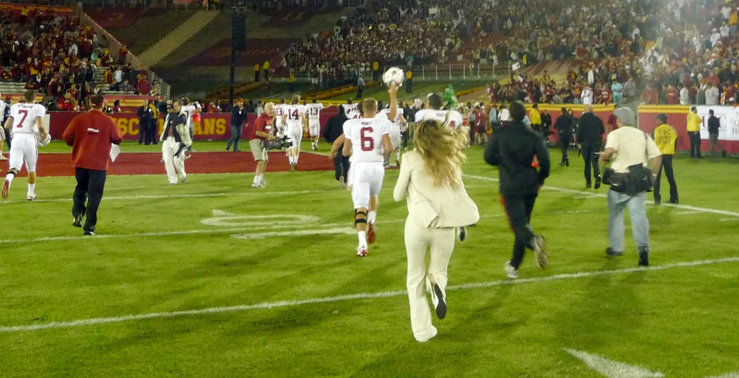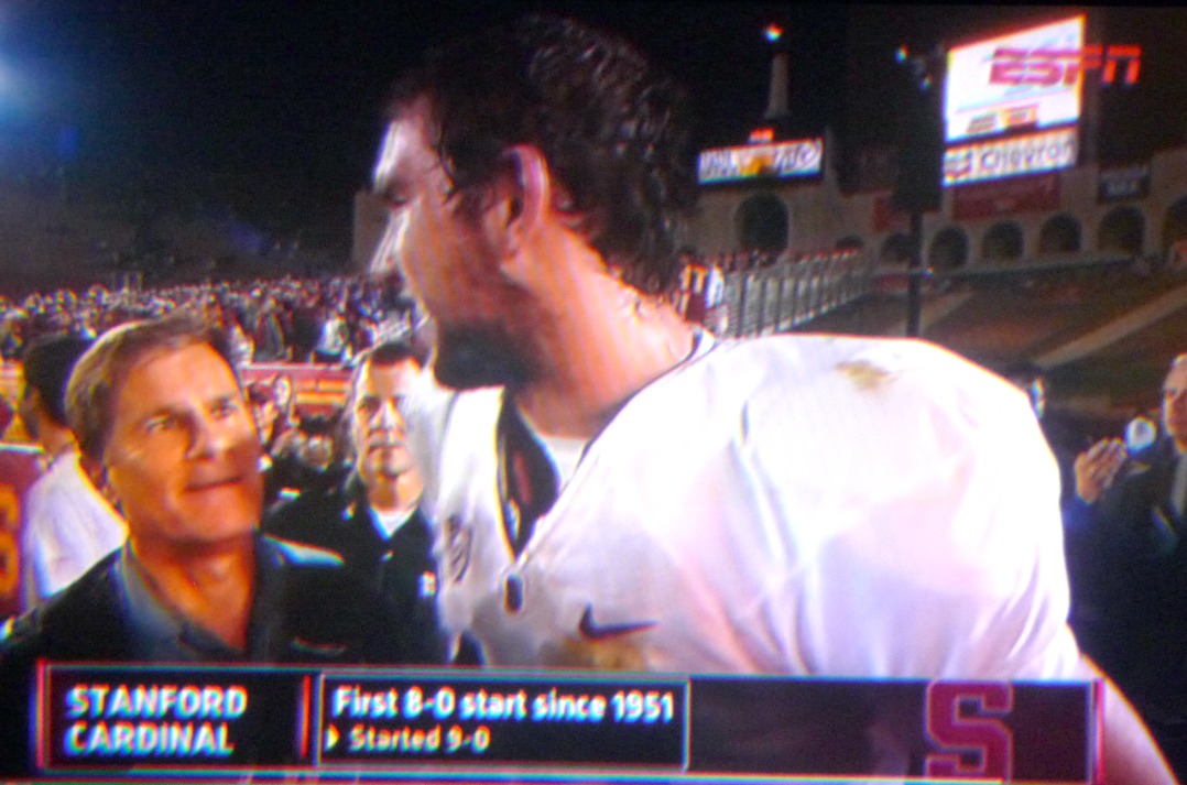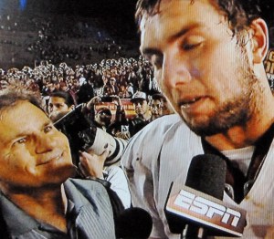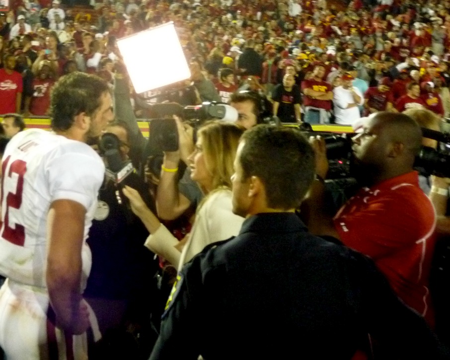 I talked with his coach David Shaw after the game and he explained in more detail what makes Luck special (besides his obvious physical attributes) and Cardinal linebacker A.J. Tarpley who recovered the game ending fumble in the end zone. I also met up with SC defensive coordinator Monte Kiffin to get his take on falling just short on national TV. And speaking of the ESPN telecast…yes that was me who had to hustle to get my KFWB mic under Luck’s mouth during his postgame interview with Erin Andrews (who if she married Luck, could go by Erin Andrew’s Luck!) 🙂