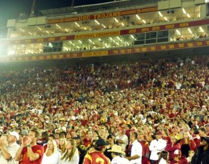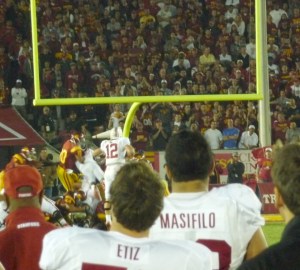 You might be surprised that this was the only football game I’ve attended this season but it was a can’t miss on my calendar. The chance to see next year’s top NFL draft pick up close and personal was more than enough to lure my tired body to downtown L.A. after a long week of working the AM drive shift for the vacationing Bret Lewis at KFWB with a daily 3:30am wake-up call. And to think I have 2 more of those weeks to come before the end of the year? I might be put out to pasture before my time?
