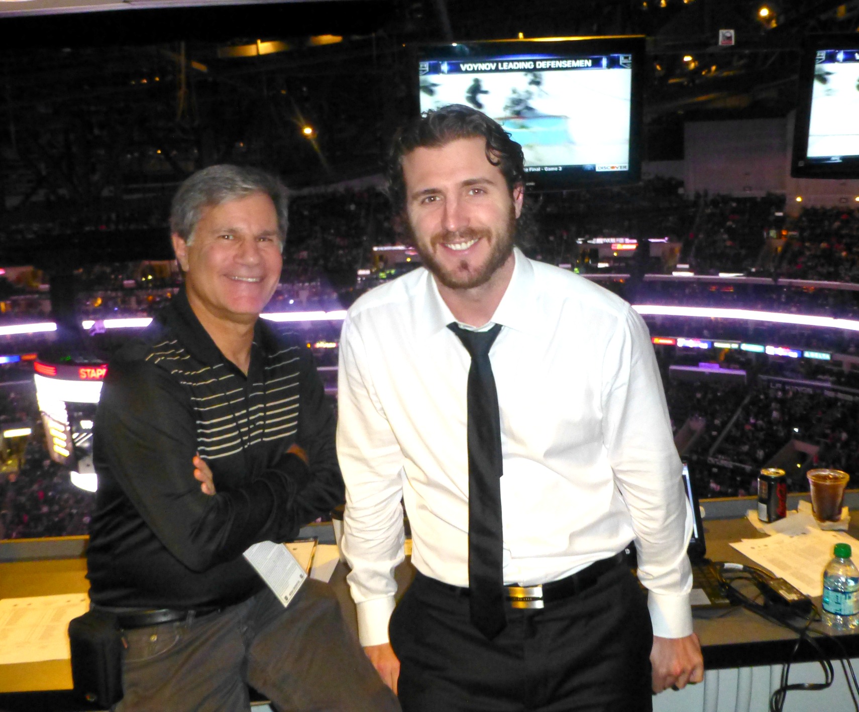 Kings defenseman Slava Voynov gave his club a 2-0 lead in the 2nd period which gives him a new club record of 4 game winning goals in the same postseason. And the Kings minus Mike Richards again found a way to make this a series. Mike came into our press area to watch the game from the 2nd period on and I asked him if he thought he might be able to go in Thursday night’s game 4 and he didn’t rule it out by simply saying ‘I hope so’. Mike was also kind enough to stop and take a picture together at what some lovingly call ‘Ted’s Sports Bar’ where I sit for every event I cover at Staples.