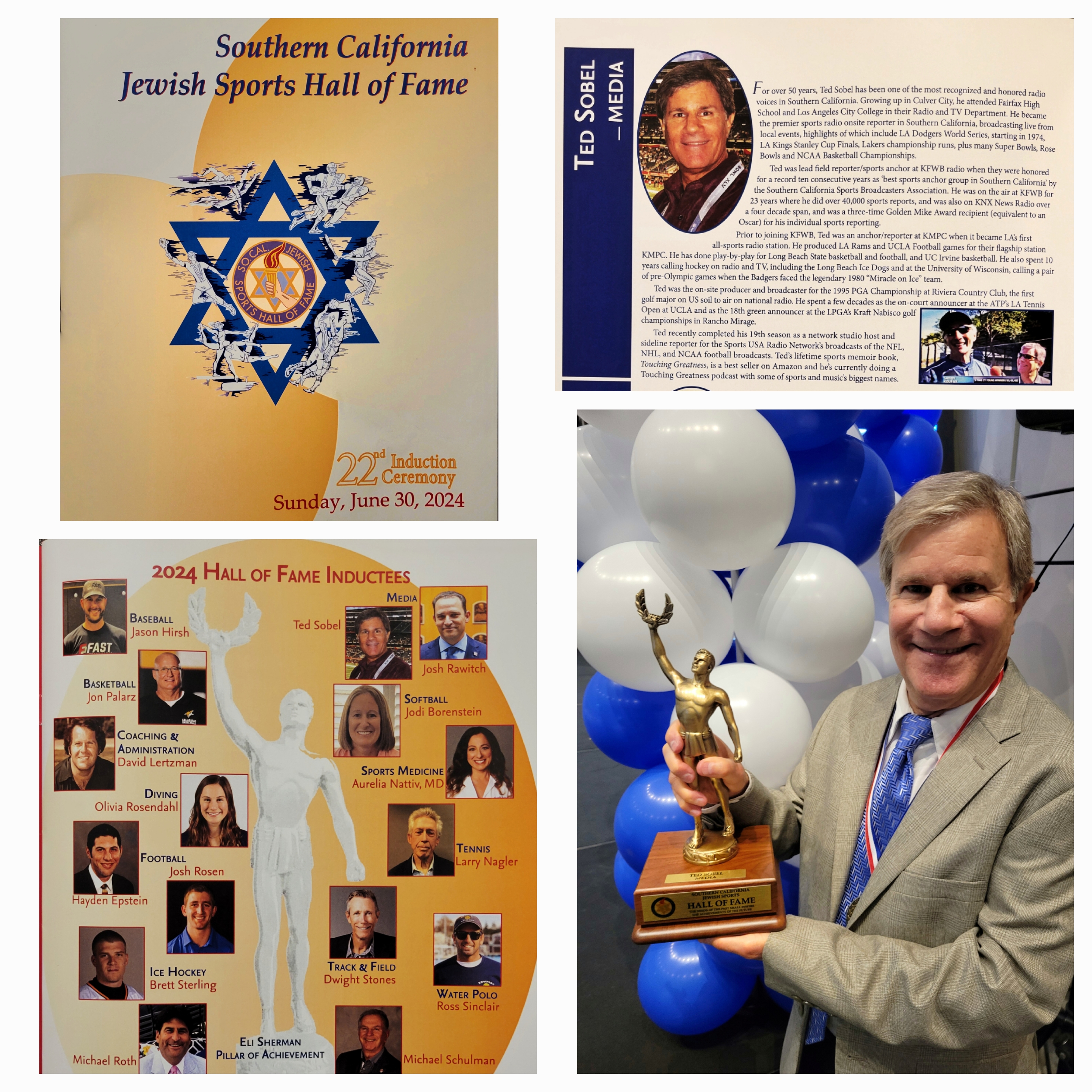 It was special to be inducted into the Southern California Jewish Sports Hall of Fame on June 30, 2024. Thank you to all who have supported my work over the 51 years in the media…it has been quite a journey and it’s not over yet. Plenty of great shows are on the horizon with my new YouTube Touching Greatness channel and another NFL season of The Inside Blitz. Hope you’ll be joining us regularly.
